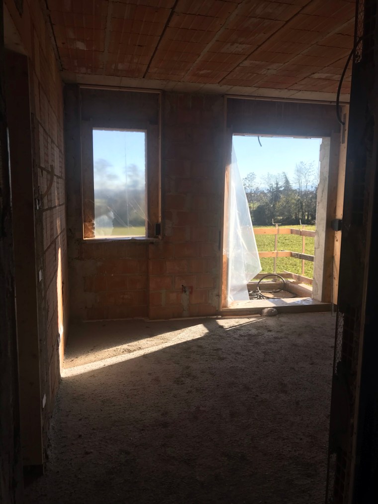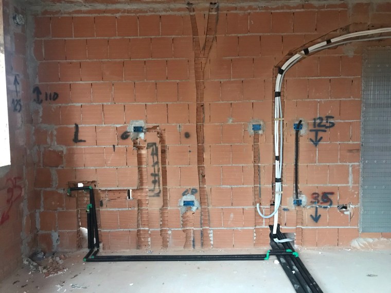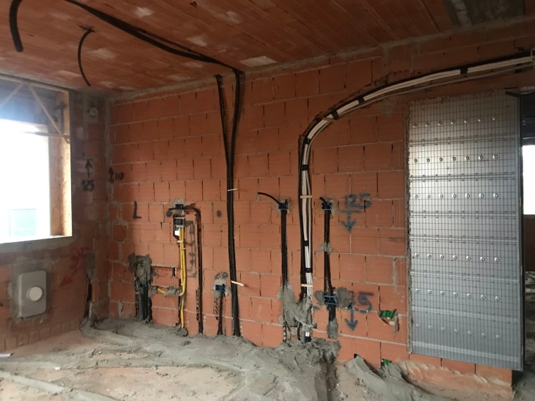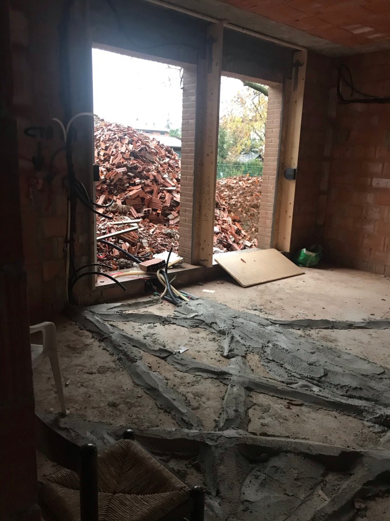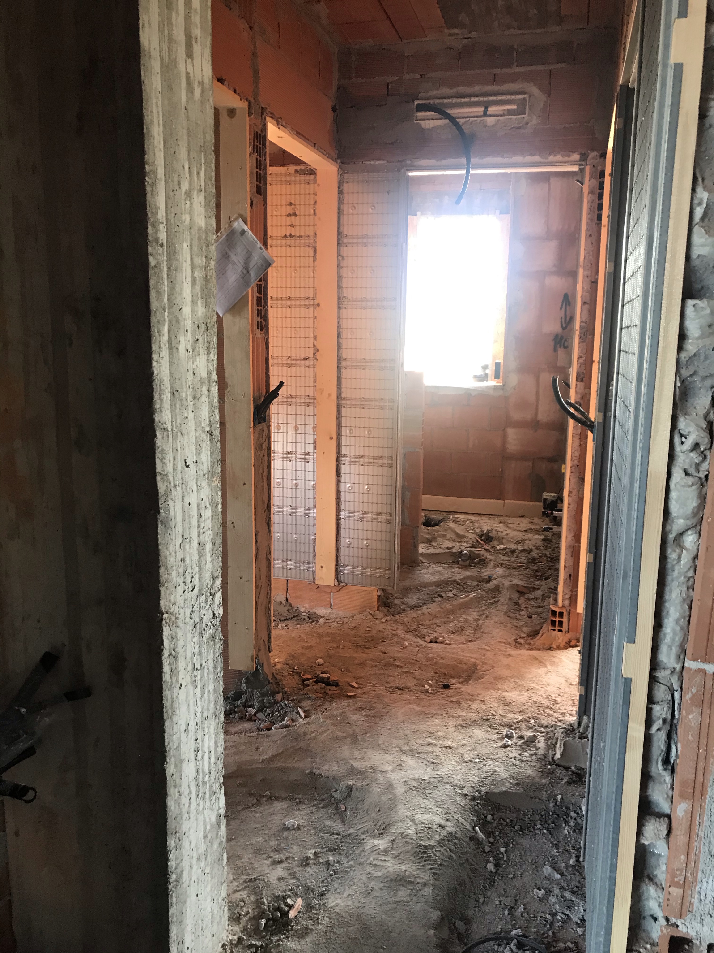 So, the last time we visited the new house in progress, all the pipes were in their birthday suit, snaking around the floor and up the walls. Today, though, they have been safely tucked into some weird cement-looking stuff… they’re definitely looking very snug and cozy in there. Apparently the next step is to fill in around them, and then add another layer of very thin pipes on top that will be for the heating. Exciting!