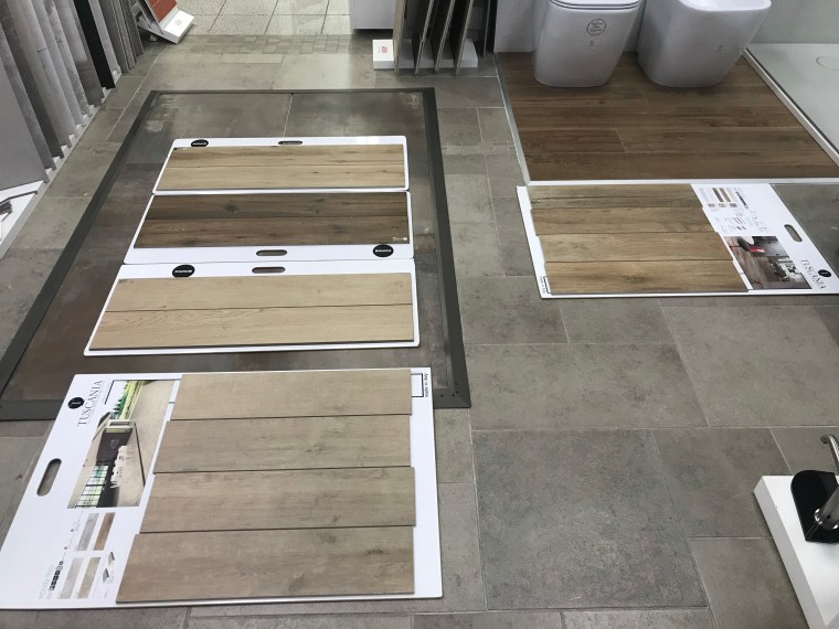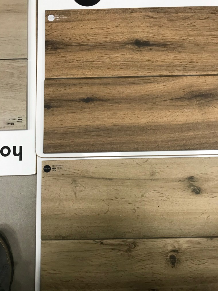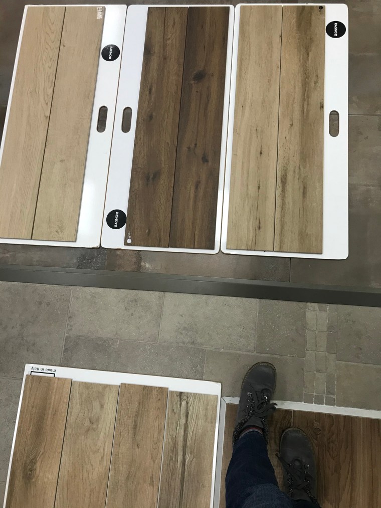 So, one very smart thing we did (in my humble opinion) is to go to the tile place twice. Once as a kind of recon mission: we wanted to just do the same floor covering throughout (apparently that’s trendy? I don’t know, but the partner felt strongly about it and I felt neutral so there we go), and we figured wood-effect tiles were the best choice because a) real wood that is also nice is out of our price range, and b) apparently wood-effect tiles would be more durable. Oh, and we definitely wanted wood-effect as opposed to fancy concrete, which is apparently what is super trendy at the moment. I’ve always loved wood floors, but was open to fake wood, also because look at it! Can you tell? I definitely wouldn’t have spontaneously called that out as fake if I hadn’t been told. And it got more realistic as the planks got bigger (and therefore more expensive).